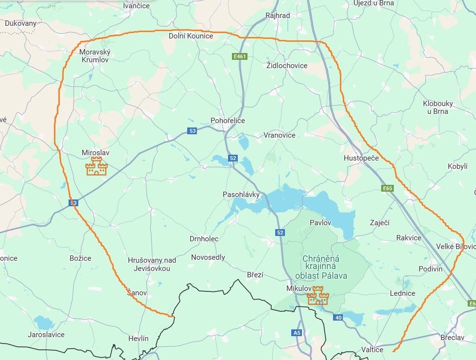 Rozvoz - okruh obci: Valtice, Podivín, Velké Bílovice, Velké Pavlovice, Hustopeče, Blučina, Židlochovice, Dolní Kounice, Moravský Krumlov, Hostěradice, Mackovice, Hrabětice
